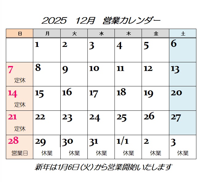 12月の営業カレンダーですが、28日(日)を年内営業最終日とします。