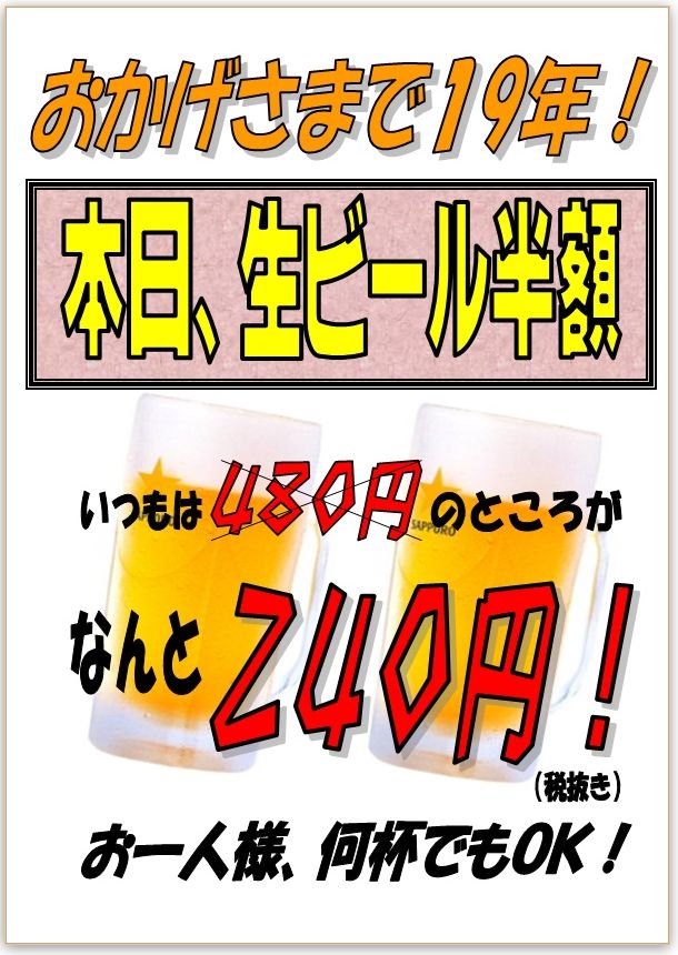 一日だけの開催になりますが、この機会に是非半額ビールを楽しんでもらえればと思っております。