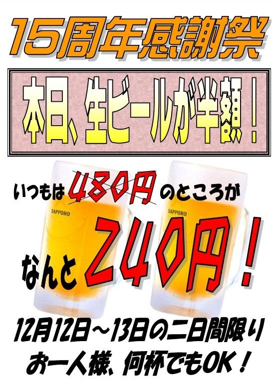 生ビールを半額の240円で提供させていただきます。