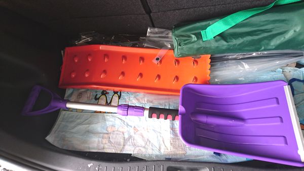 自分の車のトランクには、バッテリーケーブルと雪道脱出のためのスノーヘルパーと