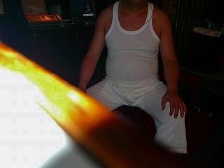 路肩の縁石に腰かけたランニング姿のおじさんが、手にはバケツを持ったままで