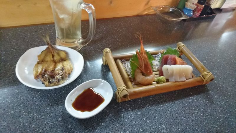 お刺身の盛り合わせと、アジの干物が運ばれてきました。