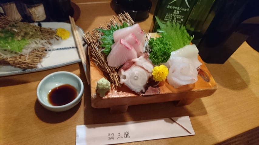 ほかに「刺身一人前をお任せで。」と頼むと、ブリ・ヒラメ・水ダコ・イカの盛り合わせでした。