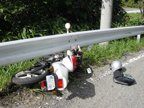 制御不能になったバイクはそのまま左の路肩へ突っ込んで、ライダーが投げ出されたようです。