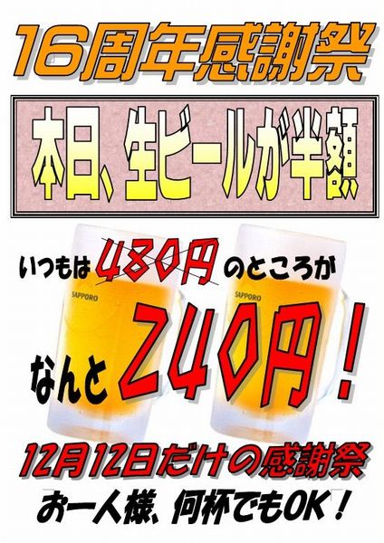 毎年恒例ですけど、日頃のご愛顧に感謝をこめて「生ビール半額キャンペーン」を開催します。