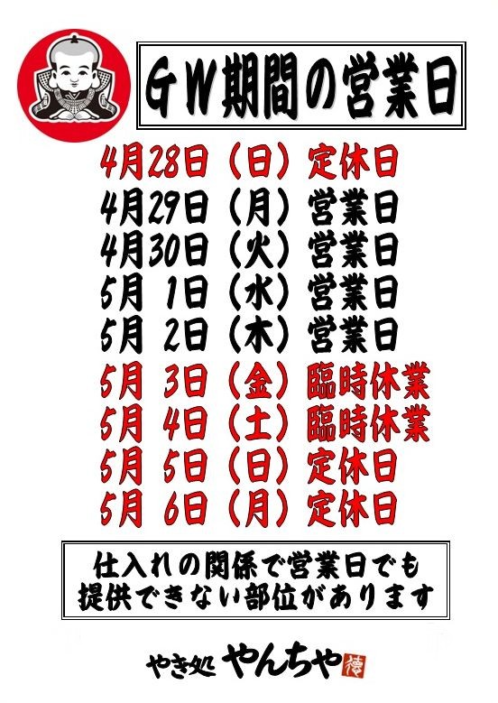 GWの営業日 毎度ありがとうございます! ゴールデンウィークの営業日程のお知らせです。 今年のゴールデンウィークは祝日ですが 29日(月) 30日(火) 1日(水) 2日(木)の前半は営業いたします。 3日(金) 4日(土) 5日(日) 6日(月)の後半は肉の仕入れが出来ませんのでお休みします。 営業予定日でも、と畜の関係で提供できない部位がありますのでご了承ください。 ご不便をおかけしますが宜しくお願いいたします。 今日は告知のみで失礼します。 コメント コメントを書く コメントを書く コメント送信