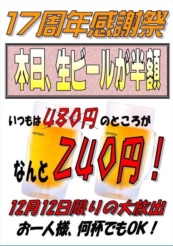 通常生ビール480円のところ、なんと240円!