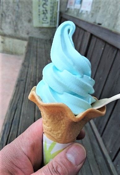食後に食べた淡いブルーが印象的な「日本海ソフト」も塩が調合されていて、