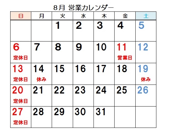 今月も変則的な営業日・休業日がありますが宜しくお願いいたします。