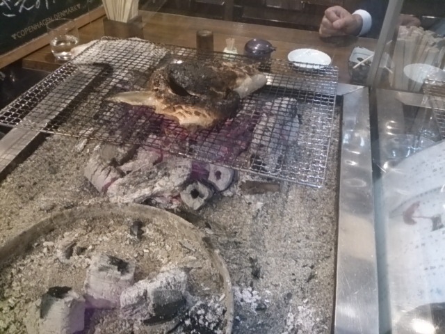 炭火を囲むコの字カウンターで、マグロのカブト焼きを注文しました。
