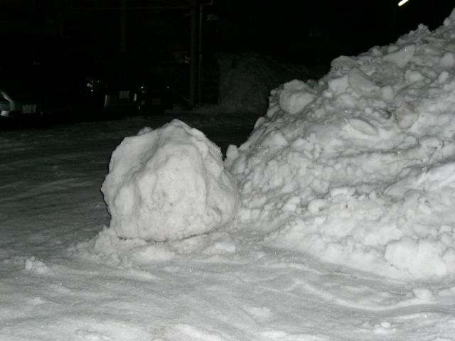 ヘッドライトで照らしながら雪玉とガップリ四つで格闘してる自分の姿に、